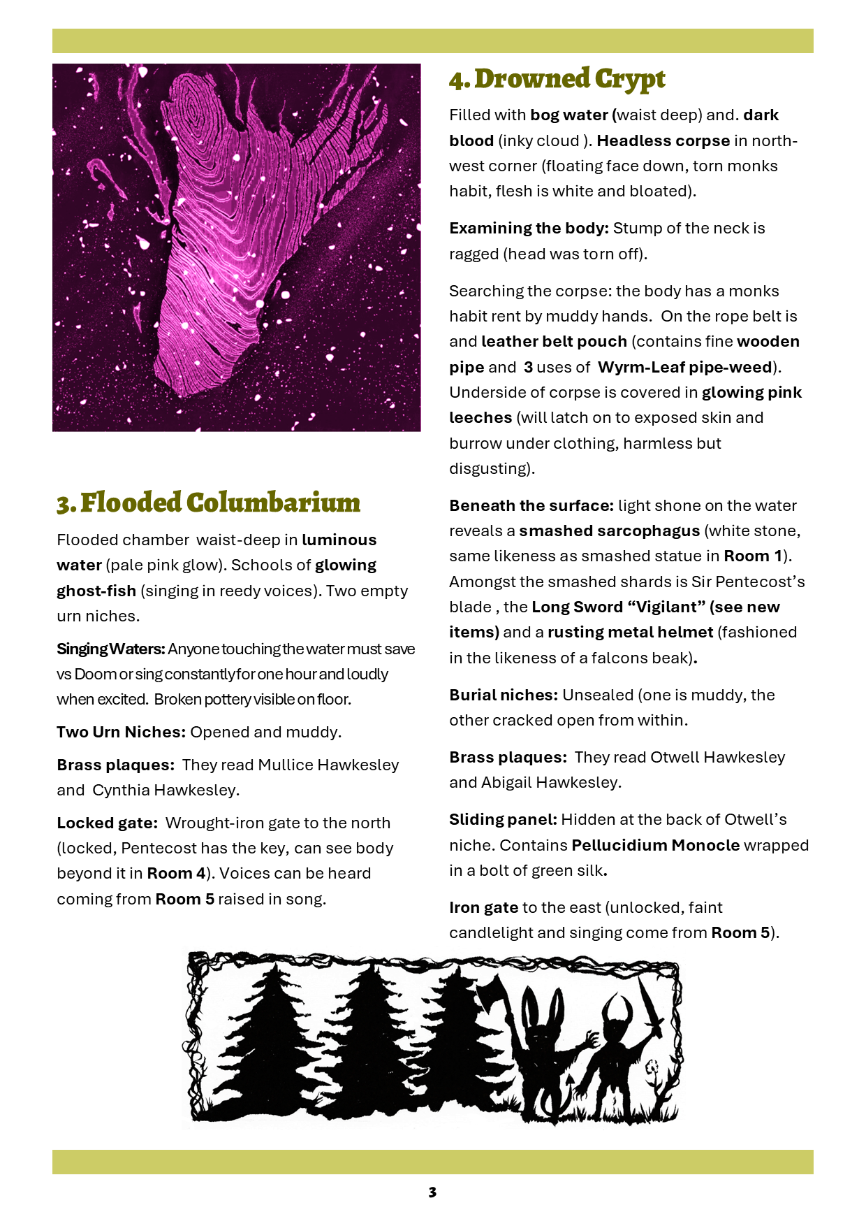 A great little scenario for players to stumble into - they'll need to handle some monstrous npcs, with lots of opportunities for it to all go wrong...the writing features some evocative details and the layout makes it highly usable