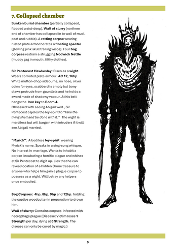 The lair consists of a flooded seven room dungeon inhabited by wights and bog corpses.
