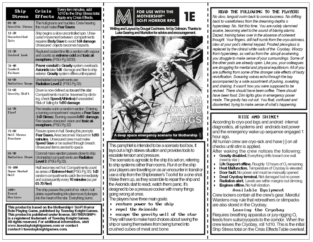 This pamphlet is intended to be a scenario tool box for Mothership 1E. It lays out a high stakes situation and provides tools to escalate tension and pressure.